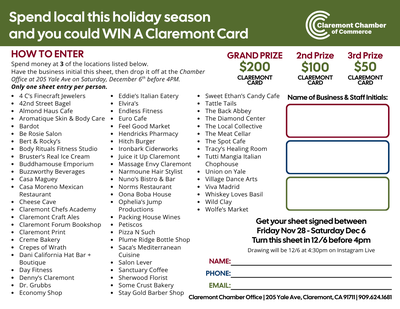 What is the Claremont Holiday Shopping Spree Sheet? We love our local small businesses, so we are encouraging people to shop, dine, and play in Claremont for the holidays! Spend money at three of the locations on the sheet, write down where you shopped, get it signed, and bring it to the Chamber to participate in the drawing for the chance to win a Claremont Card!