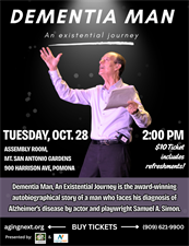 Join us at Mt. San Antonio Gardens for Dementia Man, the award-winning autobiographical story of a man who faces his Alzheimer's diagnosis by actor and playwright Sam Simon.